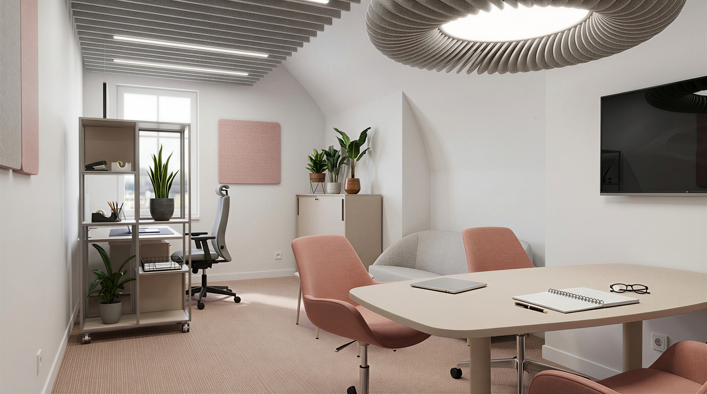 Centralnym elementem aranżacji jest strefa chill i spotkań, sprzyjająca swobodnej komunikacji i spotkaniom z zaproszonymi gośćmi. Dopełnieniem całości są indywidualne miejsca do rozmów oraz dopracowane detale — od mebli po filcowe akcenty i dedykowane oznaczenia studiów nagraniowych.